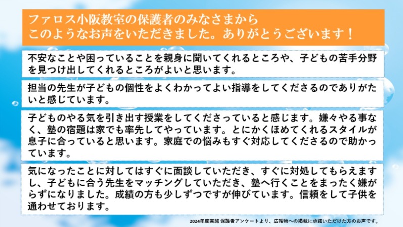 そんなファロス小阪校で、一緒に頑張りませんか?私たち教員一同、全力でサポートさせていただきます。