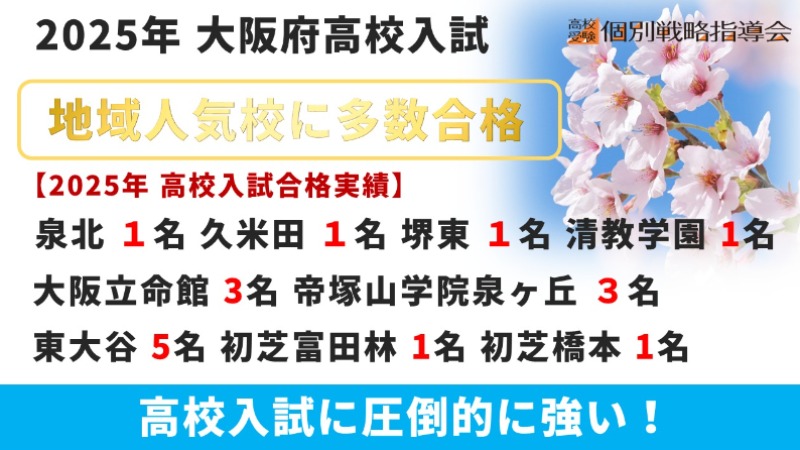 北池田・南池田・郷荘・槇尾・石尾・南松尾はつが野学園などの公立中学や私立中高では清風南海、帝塚山学院泉ヶ丘、清教学園、初芝富田林、大谷など様々学校から通塾されております。公立高校では三国丘、岸和田、泉陽、泉北、堺東、久米田高校などになります。中学受験を考えている、または迷われてる小学生も多く通塾されており、あらゆる受験に対応可能です。通塾目的も 学校準拠指導 や、定期テスト対策、個人の学習課題についての解決など様々です。お気軽にまずはお電話でご相談ください。