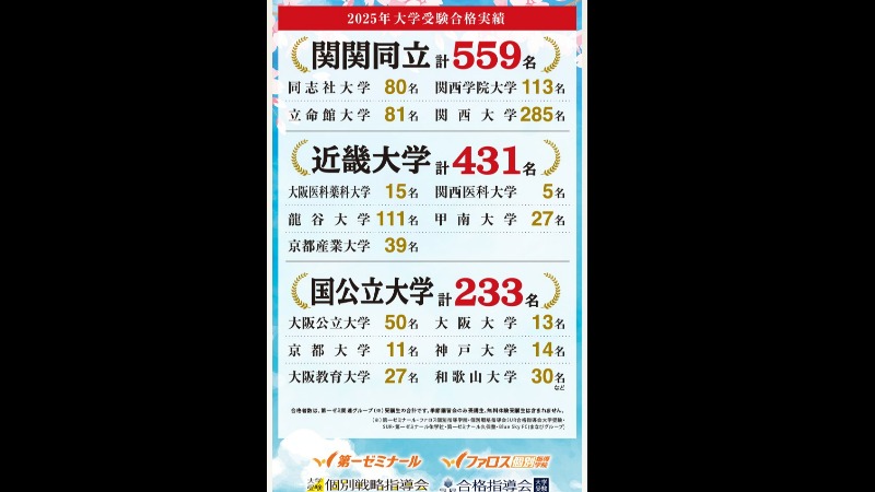 京都大学、大阪大学、神戸大学、大阪公立大学、同志社大学、立命館大学、関西学院大学、関西大学、近畿大学、京都産業大学、甲南大学、龍谷大学、摂南大学、神戸学院大学、追手門大学、他多数