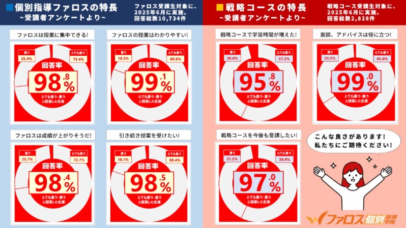ファロス個別指導学院の運営母体は近畿圏で長年の実績を持つ第一ゼミナールグループであり、「 膨大な情報 」 「 指導ノウハウ 」 「 学習ツール 」などを最大限に共有しています。