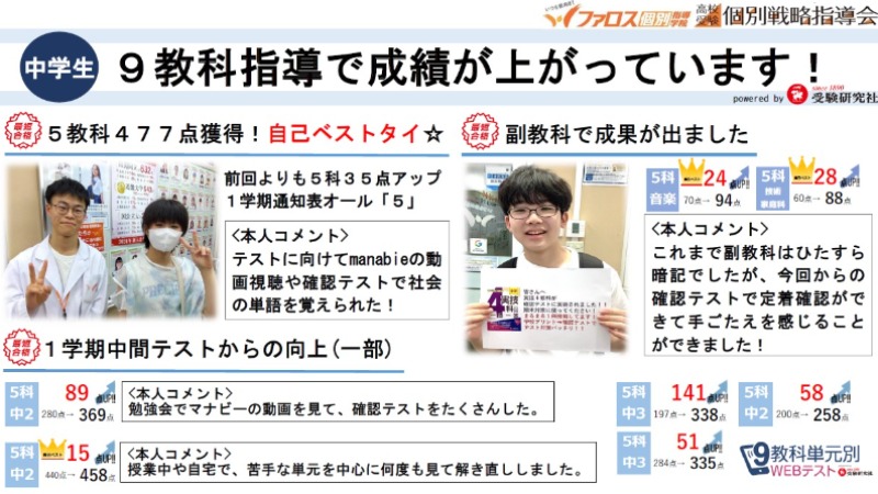 副教科まで含めた9教科単元別WEBテスト(定着度確認テスト)、精鋭講師陣による単元別解説動画(5教科)で、着実に成績向上につなげます!