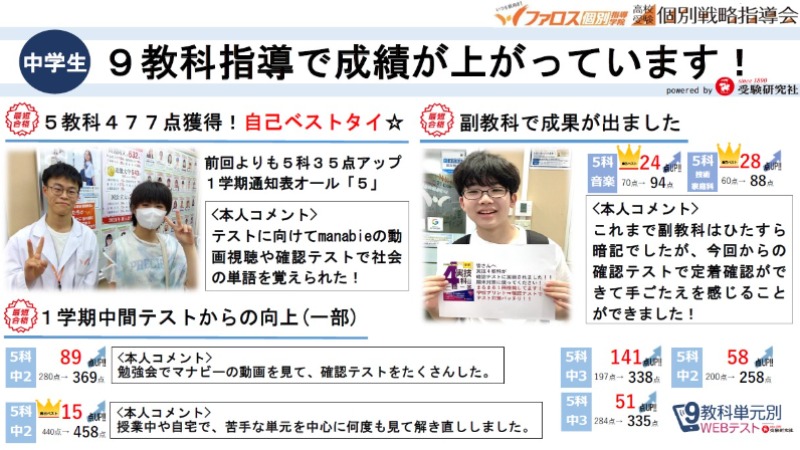 9教科単元別WEBテスト(副教科含む)、精鋭講師陣による5教科単元別解説動画で、着実に成績向上につなげます!