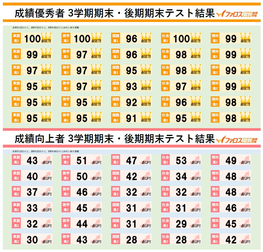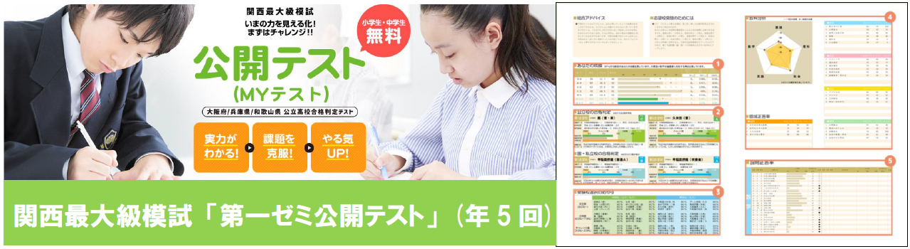 ファロス個別指導学院の運営母体は近畿圏で長年の実績を持つ第一ゼミナールグループであり、「膨大な情報」「指導ノウハウ」「学習ツール」などを最大限に共有しています。そのため個別指導塾でありながら、大規模な模試も無料で年5回実施。集団の生徒さん達とも切磋琢磨できる環境です。